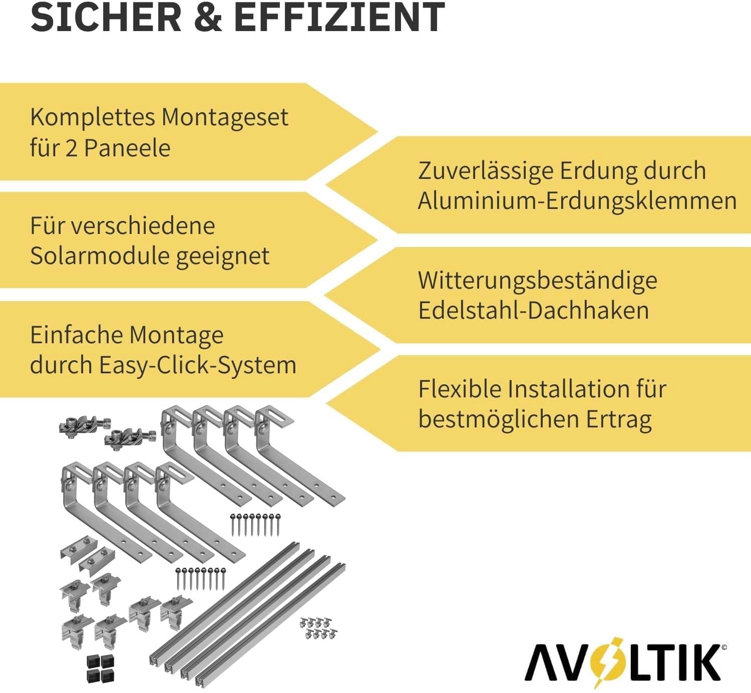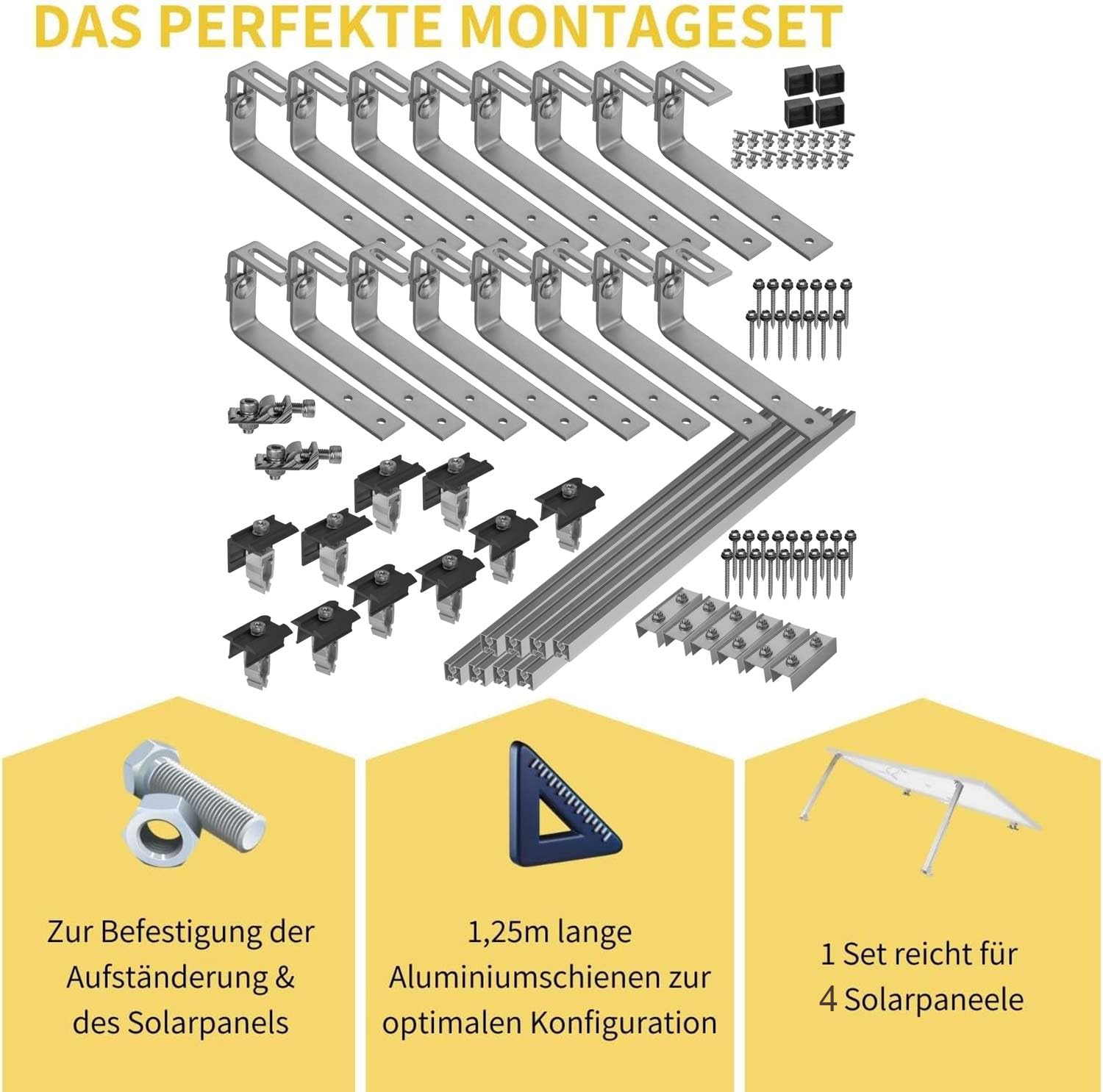 - 4 Panele: 16 speziell für Bitumendächer geeigneten verstellbaren Edelstahl Bitumendachhaken, 6 Mittelklemmen, 4 Endklemmen, 8 stabilen 40x40 Aluminiumschienen, 6 Aluminium-Verbinder mit Stahlschrauben und 2 Aluminium-Erdungsklemmen und 4 schwarze Endkappen