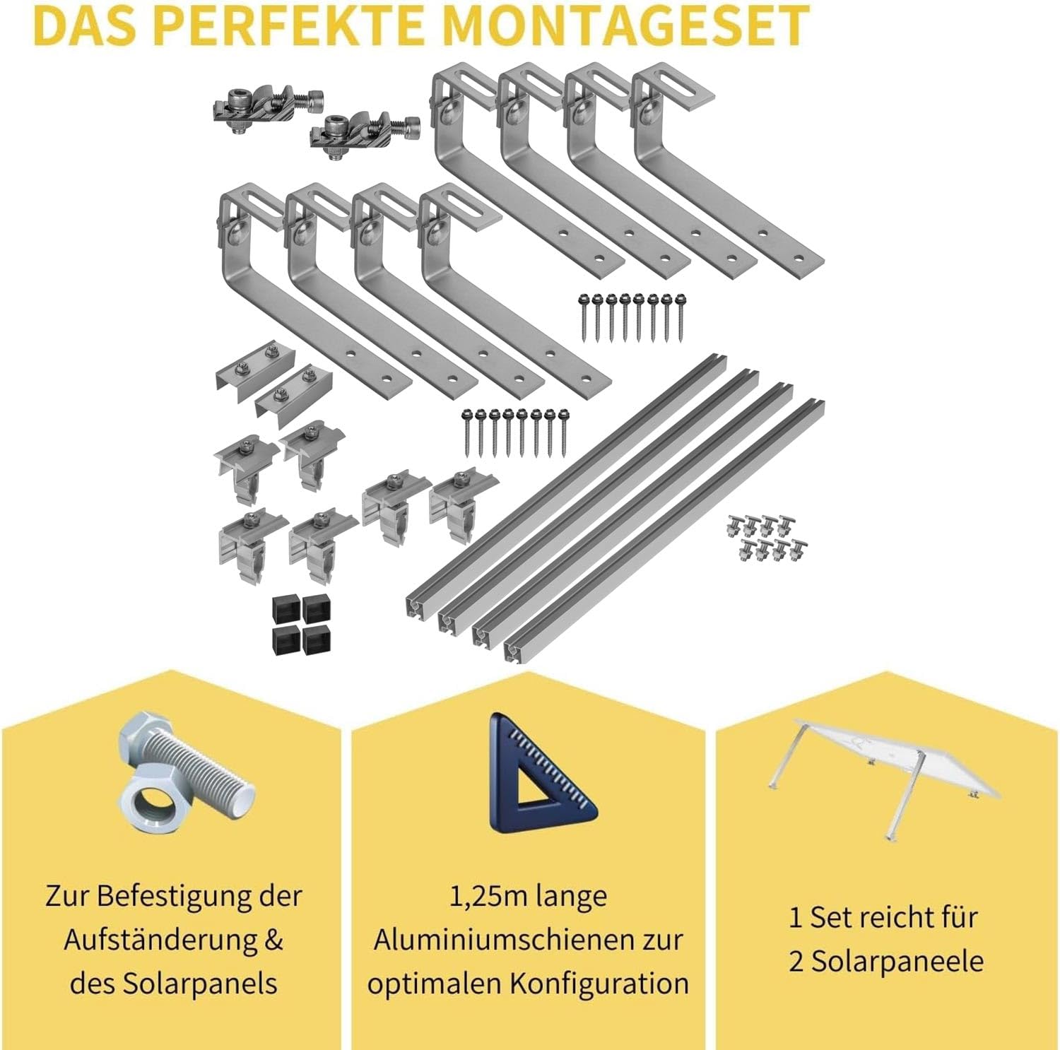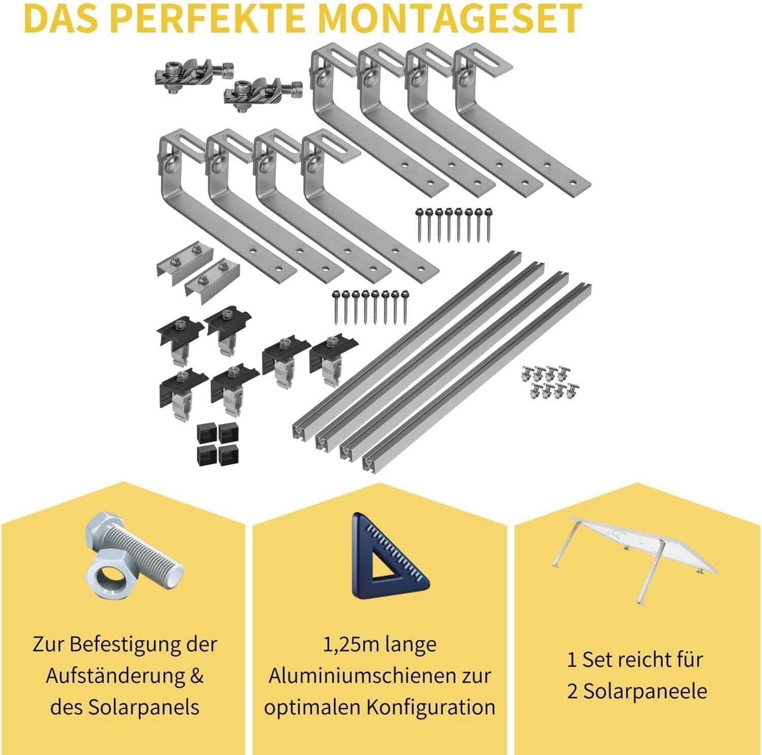 - 2 Panele: 8 speziell für Bitumendächer geeigneten verstellbaren Edelstahl Bitumendachhaken, 2 Mittelklemmen, 4 Endklemmen, 4 stabilen 40x40 Aluminiumschienen, 2 Aluminium-Verbinder mit Stahlschrauben und 2 Aluminium-Erdungsklemmen und 4 schwarze Endkappen